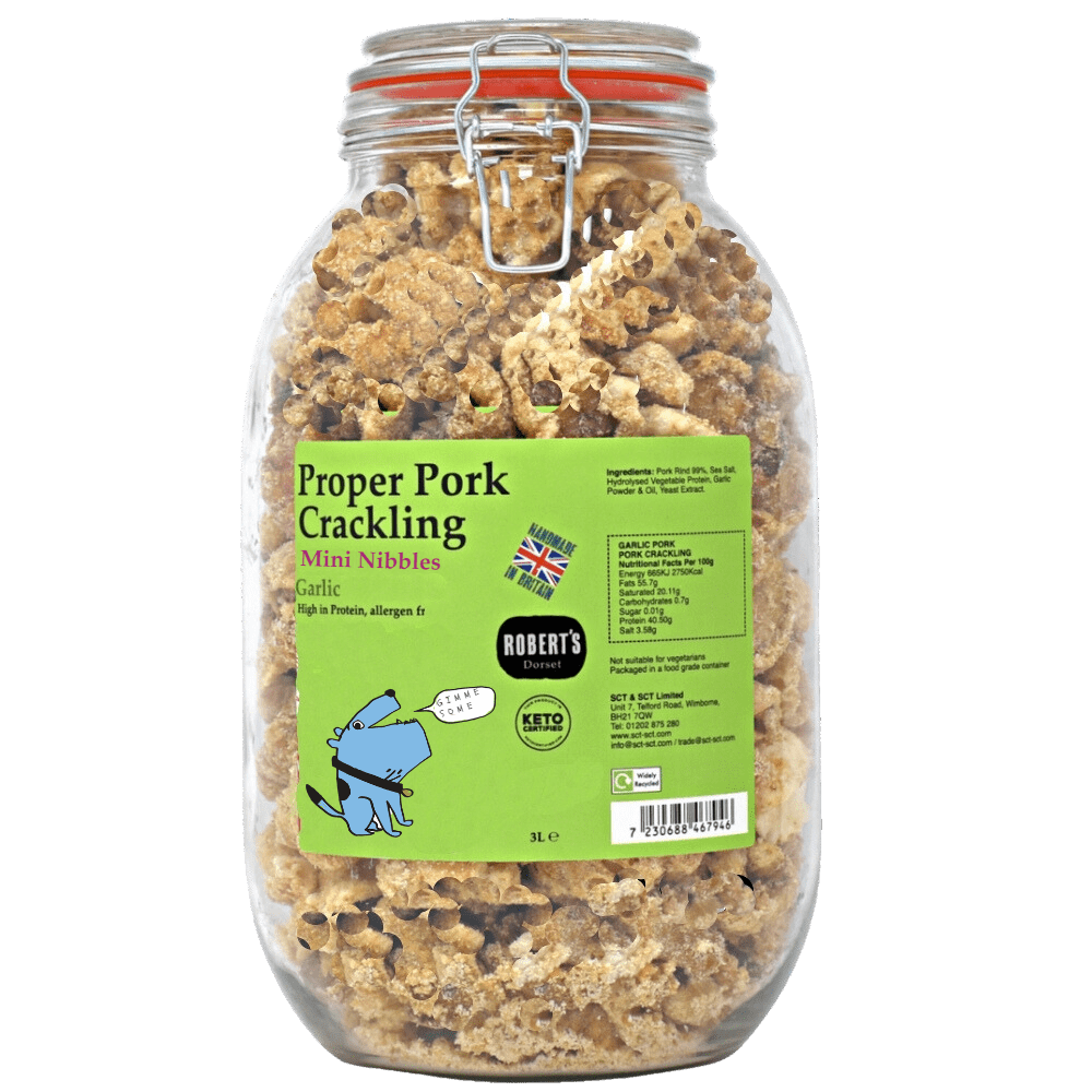 Whether you want to stock up for your own snack supply or, share the joy at parties and family gatherings, our 3L jars come packed full of our deliciously crunchy Proper Pork Crackling Mini Nibbles.