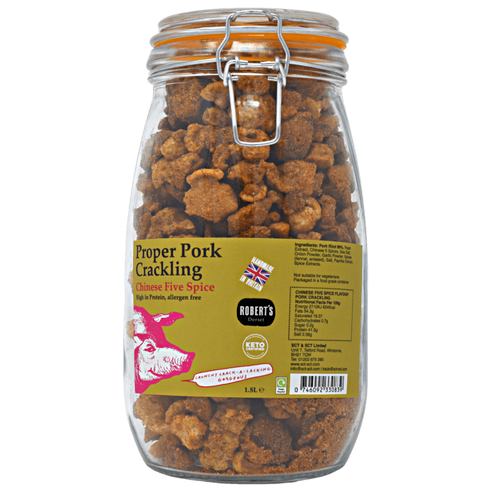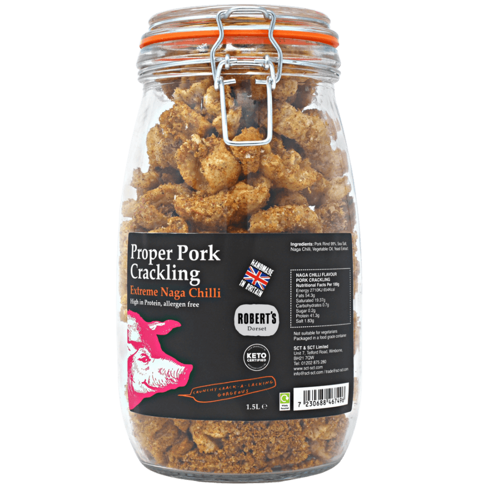 Our collection of authentic Proper Pork Crackling boasts an impressive range of 11 delicious flavours. Triple cooked for the perfect crunch, our Proper Pork Crackling is 100% allergen free, 100% keto certified and contains no artificial flavours.